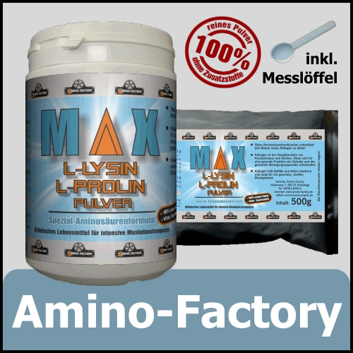 Lysin kann das Knochenwachstum fördern und die Zellteilung anregen. Es ist am Aufbau von Kollagen beteiligt und unterstützt den Fettstoffwechsel. L- Lysin fördert den Proteinaufbau, die Wundheilung und die Calciumspeicherung. Es kann den Fettabbau unterstützend und zu einer besseren Speicherung von Calcium beitragen. L-Lysin ist vor allem zuständig für die Bildung von Hormonen und Antikörpern sowie Enzymen. Sie sind ein bedeutungsvoller Baustein des Bindegewebes, vor allem des Kollagens. Prolin ist bedeutent für Glenke, Sehnen und ein gesundes Herz. Es ist ein wesentlicher Bestandteil vom Kollagen, welches in Knochen und Bindegewebe vorhanden ist. Wenn Sie die Grundlagen einer ausgewogenen Ernährung einhalten, bedarf es im Normalfall keiner zusätzlichen Supplementierung von dieser Aminosäure. In Lebensmittel wie z.b. Casein und Milcheiweiß sind eine gute Quelle für Prolin. |