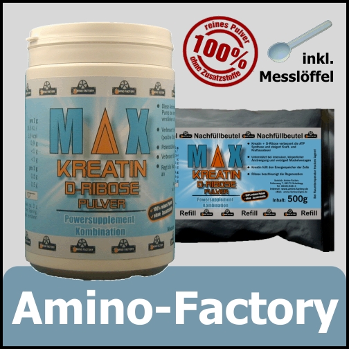 1) Kreatin ist ein ganz normaler Nahrungsbestandteil, der am meisten in Fleisch und Fisch enthalten ist. In pflanzlichen Nahrungsmitteln ist die Menge an Kreatin dagegen sehr gering. Bei einer normalen, ausgeglichenen Ernährung beträgt die tägliche Zufuhr an Kreatin in etwa 1,0 g, zudem kann der Körper ca. 1,0 g selbst produzieren. Ca. 90-95% davon wird im Muskel gespeichert. Kreatin ist ein Energiezwischenspeicher und an der Herstellung von ATP beteiligt. ATP ist die universelle Speicherform für die chemische Energie in der Muskelzelle. Bei einer kurzen, intensiven Anstrengung ist Kreatin das Erste, das von der Muskelzelle benötigt wird, um ATP sehr schnell wieder herstellen zu können. Erst danach greift unser Körper zur Herstellung von ATP auf andere Energiespeicher zurück, z.B. Glykogen (Zucker), Muskelglykogen, Leberglykogen oder freie Aminosäuren. Das ist allerdings etwas aufwändiger und nimmt bei der Umwandlung mehr Zeit in Anspruch. 2) Ribose ist eigentlich ein ganz normaler Einfachzucker. Der wesentliche Unterschied zum Einfachzucker wie Glukose (Traubenzucker) besteht jedoch darin, dass die Zentralstruktur von Ribose aus 5- Kohlenstoffatomen besteht. Die Zentralstruktur von Glukose hingegen besteht aus 6- Kohlenstoffatomen. Das interessante an der Ribose ist, dass es als Energiesubstrat genutzt werden kann und direkt am Aufbau von ATP beteiligt ist und nicht erst in eine andere Substanz umgewandelt werden muss. Somit kann sehr schnell das ursprüngliche Energieniveau wieder hergestellt werden. |